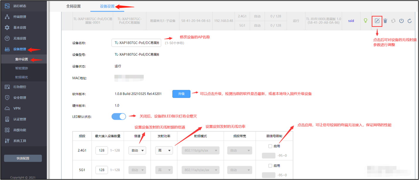 设置被路由器管理的子设备,可点击【设备管理->集中设置->设备设置】,主要配置项:设备名称、升级、更改信道、更改射频模式等。如下图: