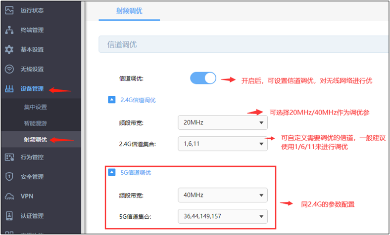 对无线信道、功率进行调优,调优后可以减少无线干扰,获取更好的无线体验。点击【设备管理->射频调优】,根据需求开启信道调优、功率调优和定时调优。如下图: