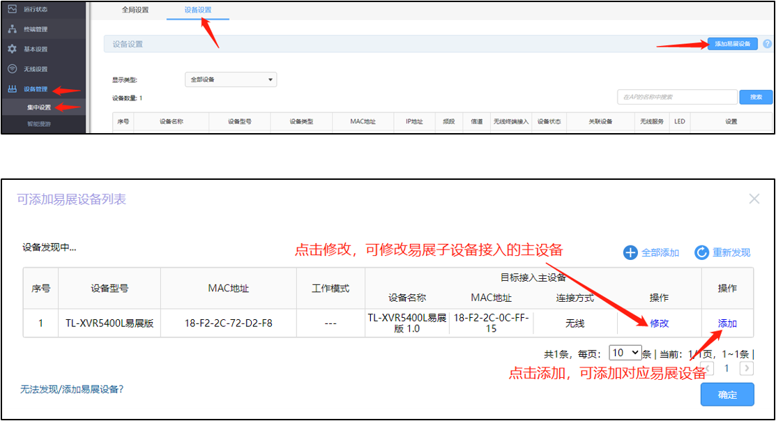 (2)路由器管理界面中软件发现时,需要登录TL-R6812TP-AC管理界面,点击【设备管理->集中设置->设备设置】,点击<添加易展设备>,设备会不断发现并将可添加的易展设备展示在列表中,点击条目右边的<添加>按钮即可添加管理易展子设备。如下图: