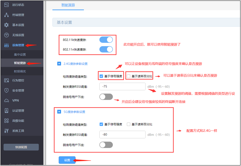 智能漫游能够让终端在移动过程中也不会断开无线网络,快速的自动连接到新的设备上。点击【设备管理->智能漫游】,开启802.11kv智能漫游,并设置相应的漫游阈值,建议使用默认参数。如下图: