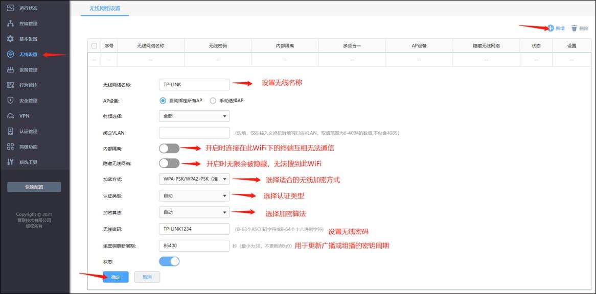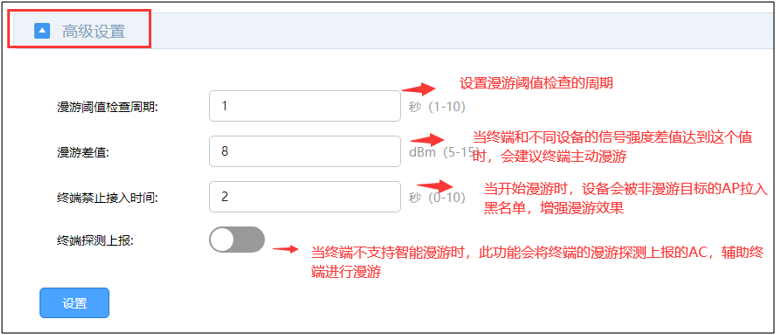 说明:智能漫游和射频调优根据需求设置,也可以不设置,推荐使用默认的配置。